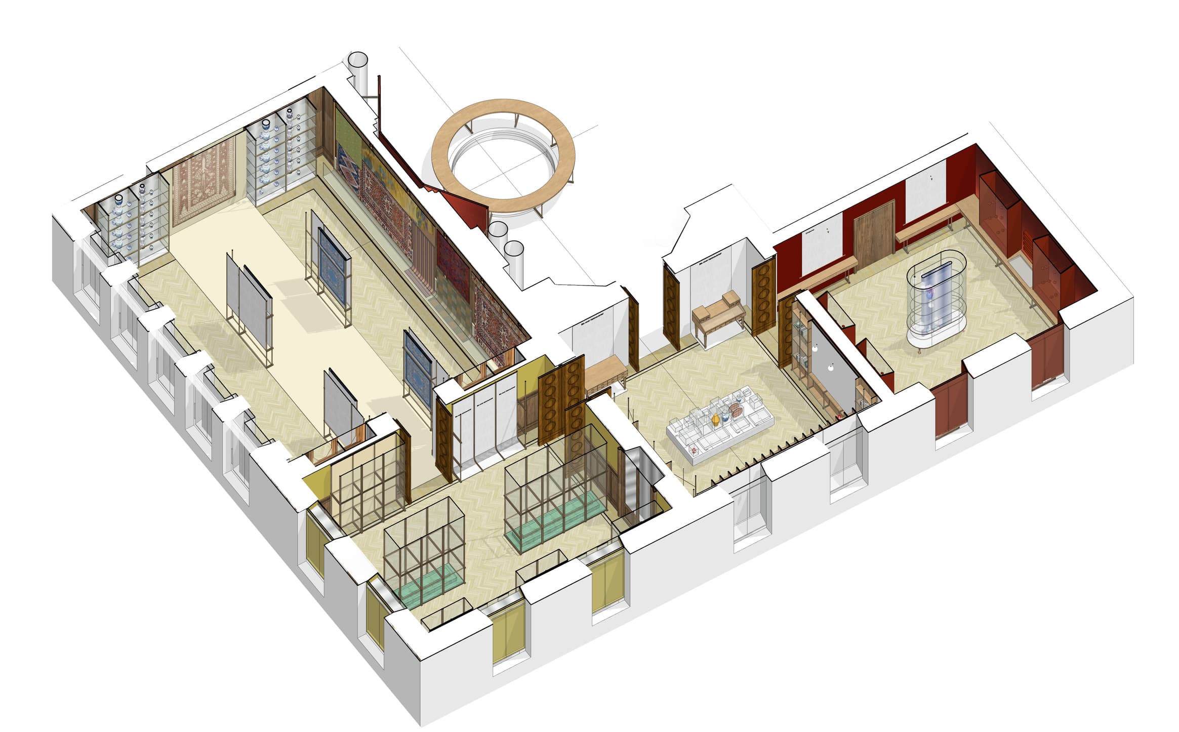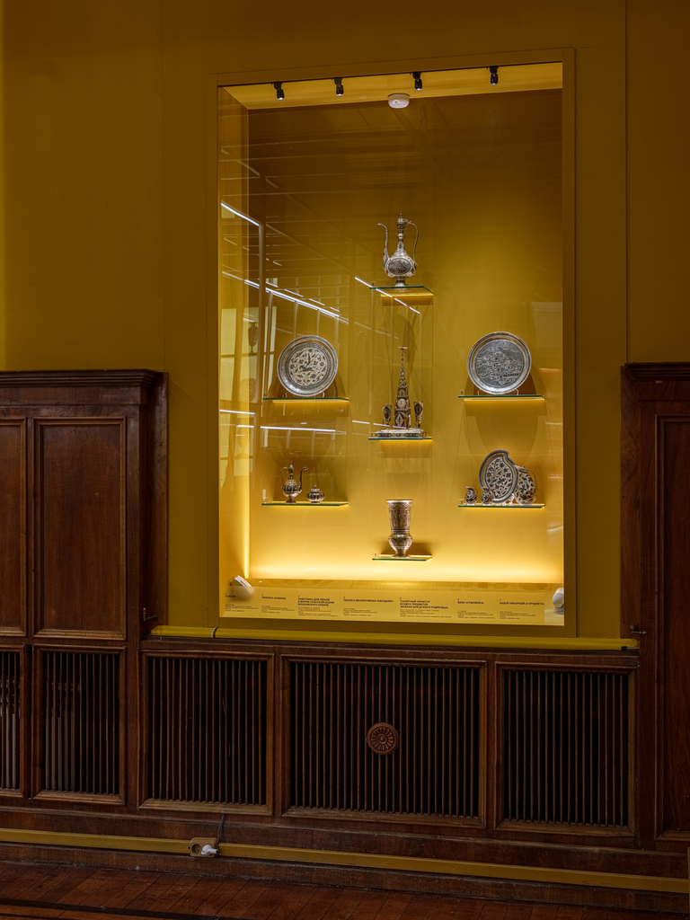 In the architectural forms and showcase details, the team sought to create a sense of archival depth and abundance of objects, reminiscent of early Soviet exhibitions. Historical references are combined with authentic elements — in some areas, original showcases from the museum’s storage were reused. For example, the tall shelving unit with glass objects in the center of the Red Hall was created on the basis of an antique display cabinet made of mahogany, dating back to the early 20th century.