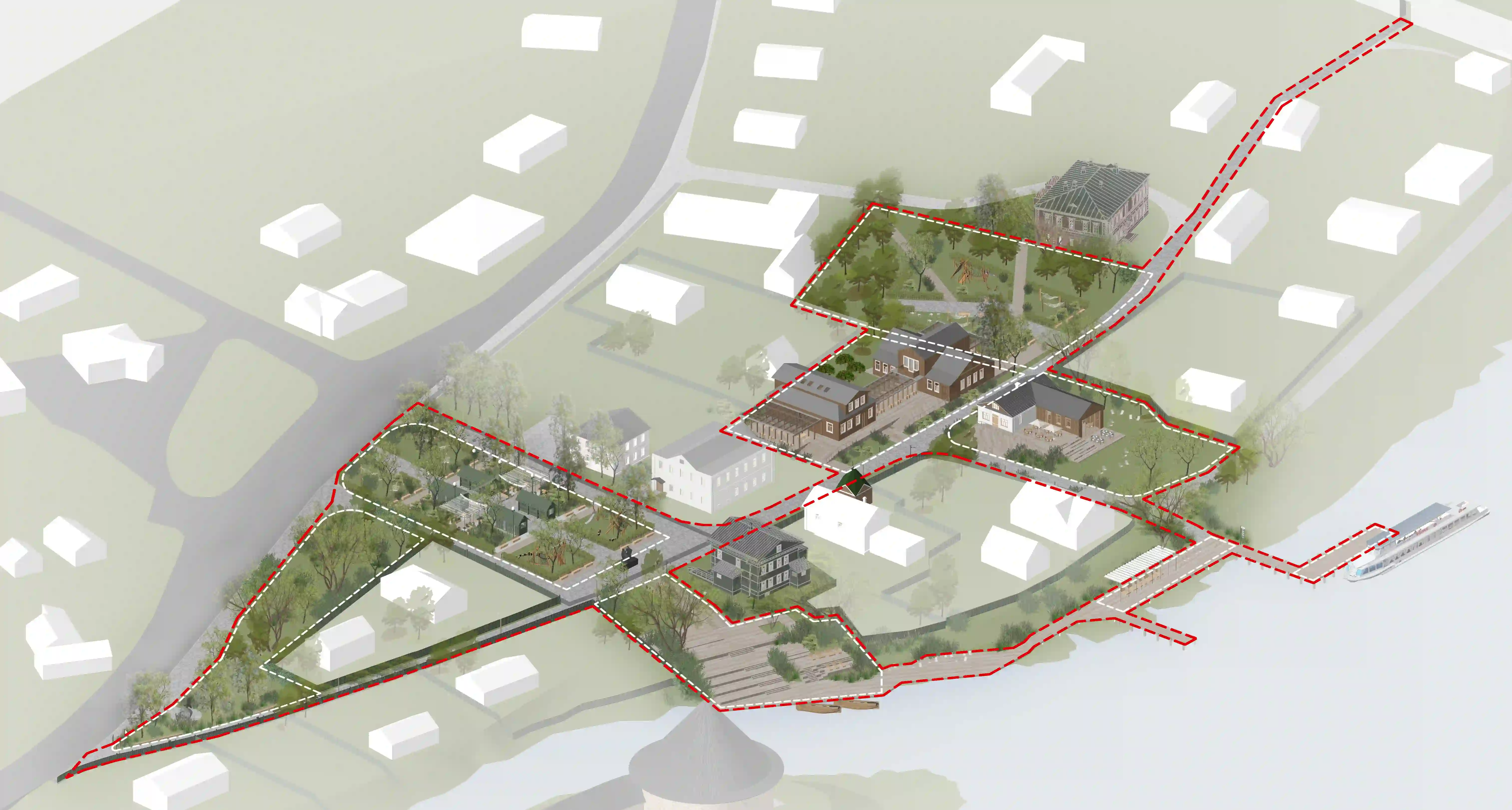 At the same time, the existing historical and natural environment is preserved, with careful integration of modern structures and small architectural forms.